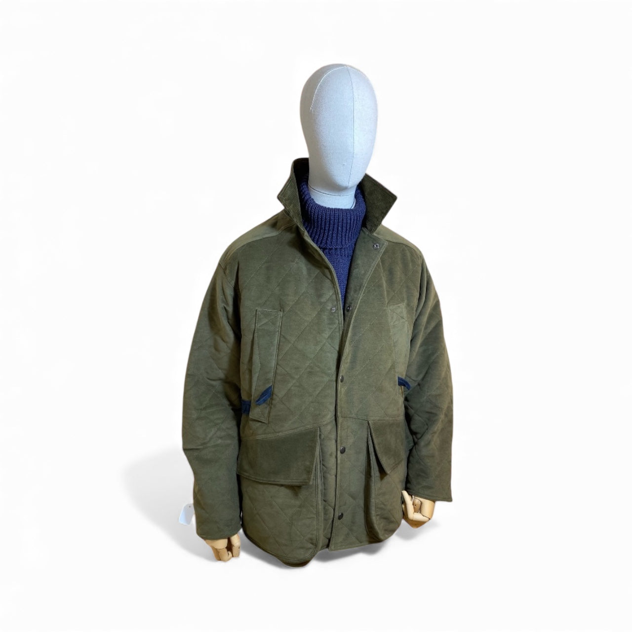 Made in a green moleskin fabric with cotton Tattersal lining and with a soft cord collar.