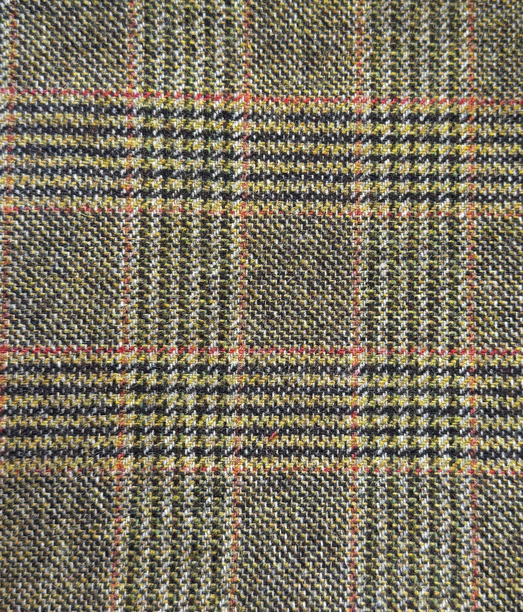 A 14oz brown and green Glen check design tweed with orange overcheck